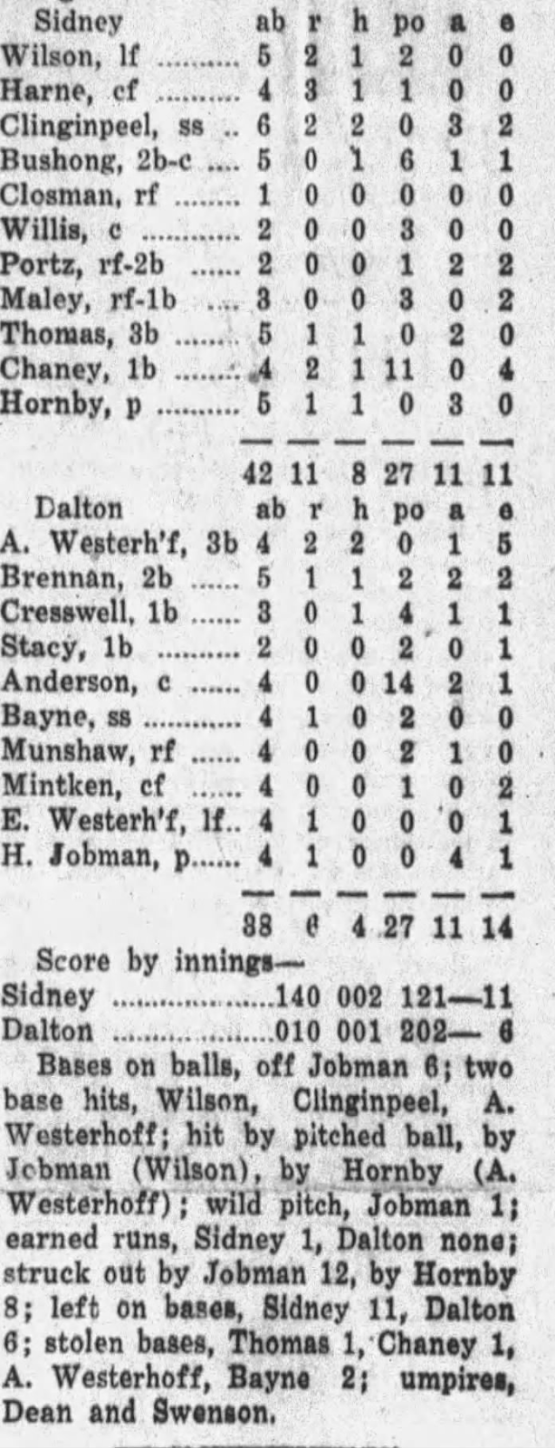 With a little searching I found that Dalton played in the Wheatbelt League in 1932, centered in Cheyenne County, Nebraska. Dalton's population of 453 was about par for the league, to give you an idea of its scale. But in those days even villages in middle-of-nowhere Nebraska had staunch weekly newspapers, and Dalton's team was covered by the Dalton Delegate.